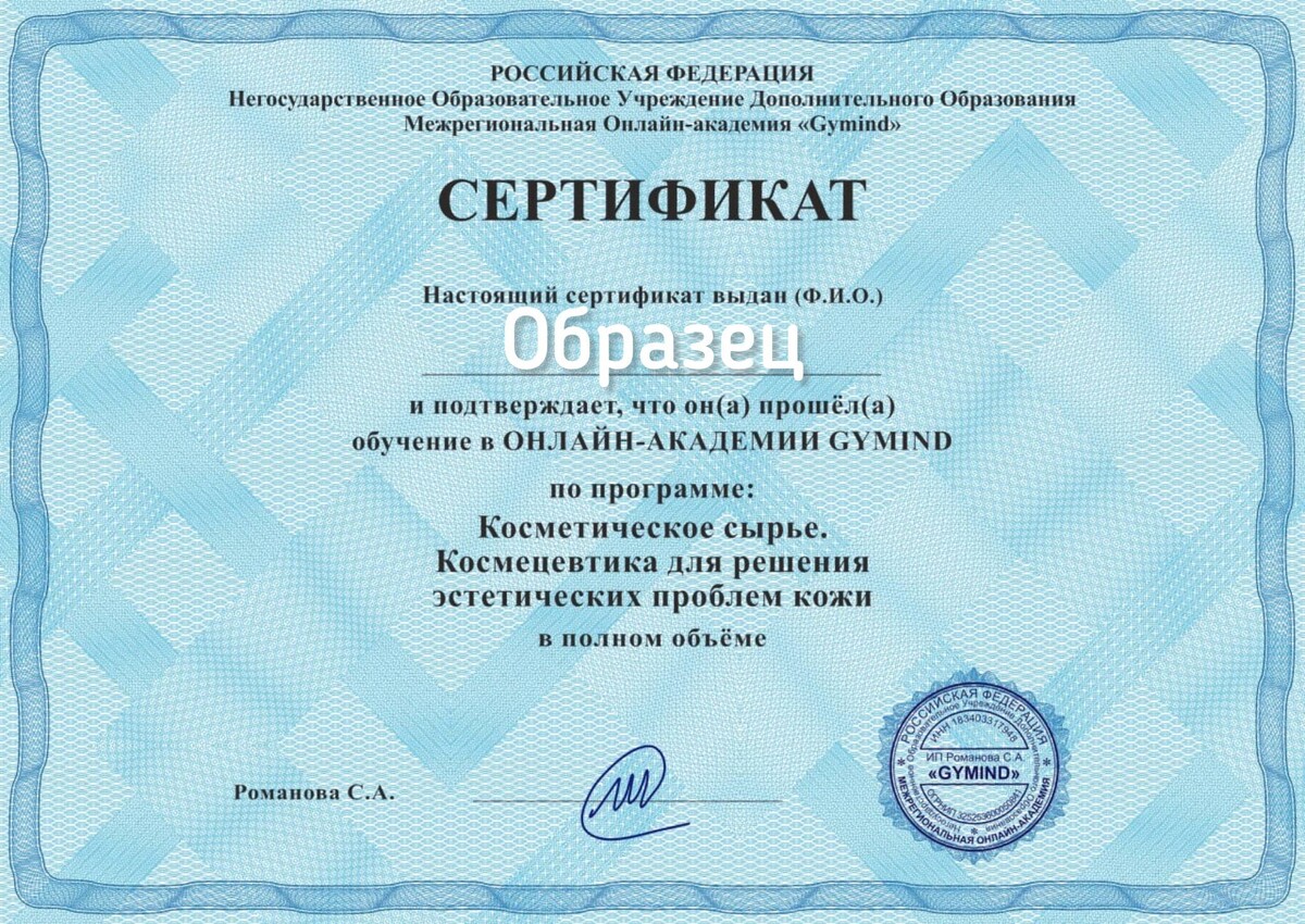 По окончании курса вы получите Сертификат подтверждения о том, что прошли обучение по программе: Косметическое сырьё. Космецевтика для решения эстетических проблем кожи