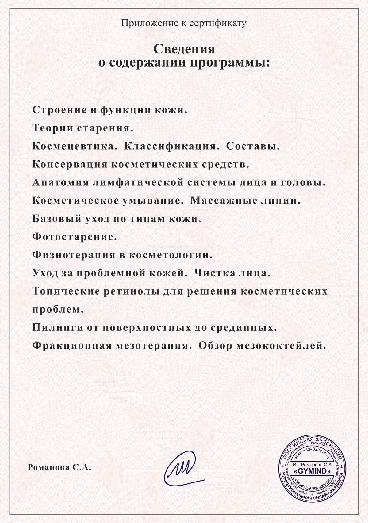 В конце курса вы получите сертификат, о том что прошли обучение по программе: "Косметик", с приложением.