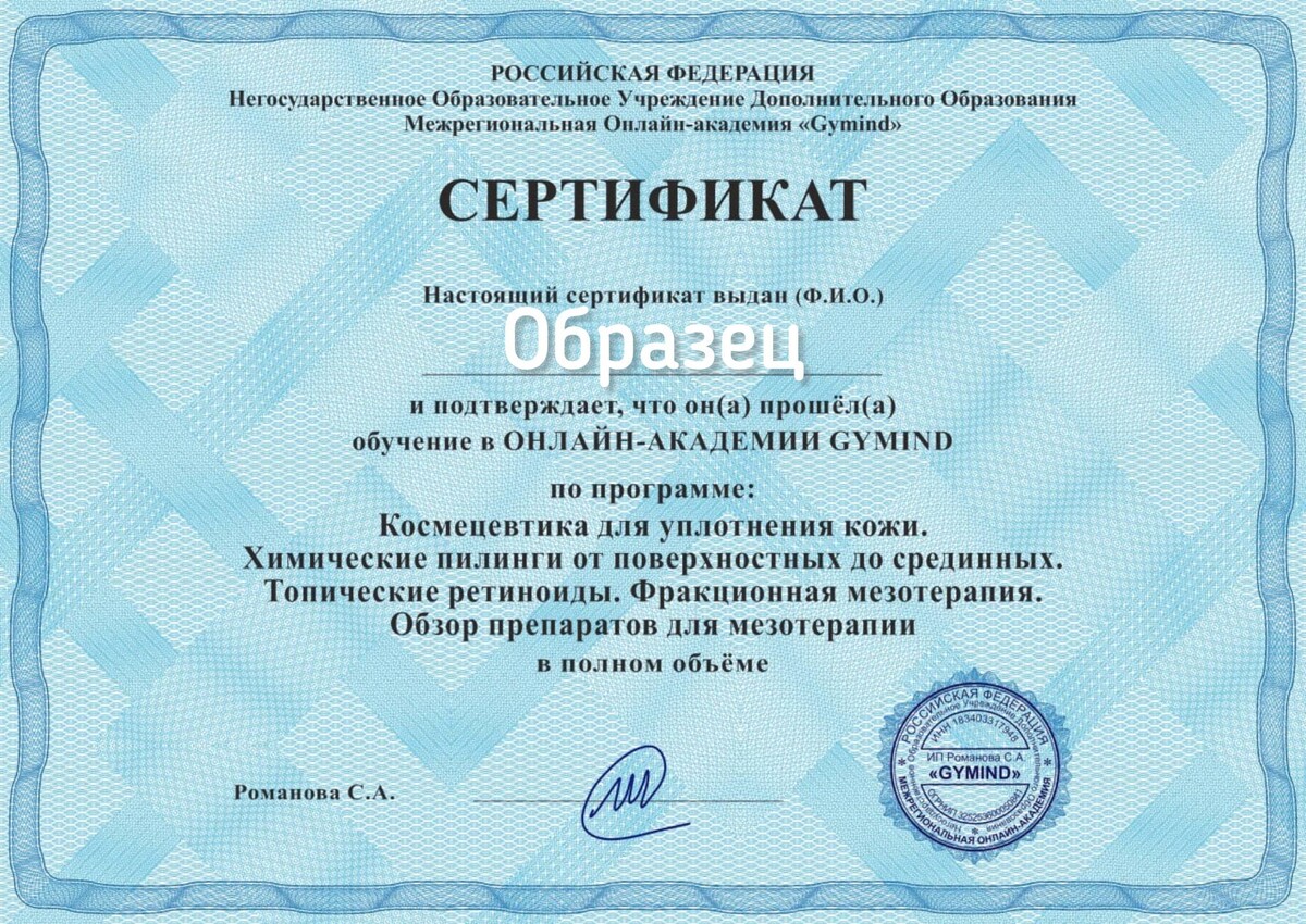 По окончании курса вы получите сертификат, о том что прошли обучение по программе: "Космецевтика для уплотнения кожи: